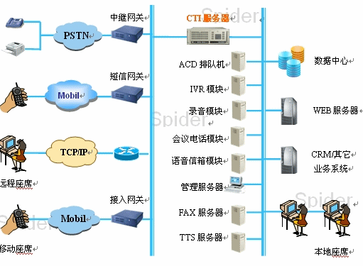 隨著呼叫中心相關(guān)技術(shù)的發(fā)展,呼叫中心的功能日益豐富,其組成結(jié)構(gòu)也日益復(fù)雜。一個(gè)完整的呼叫中心可以認(rèn)為由基本部分和擴(kuò)展部分兩部分組成。呼叫中心的基本組成部分為:自動(dòng)呼叫分配模塊(ACD)、IVR交互式語音應(yīng)答系統(tǒng)、CTI服務(wù)器、錄音、人工座席、班長(zhǎng)席、后臺(tái)管理系統(tǒng)等;擴(kuò)展模塊包括FAX服務(wù)器、web服務(wù)器、email服務(wù)器及語音信箱、會(huì)議電話等功能。