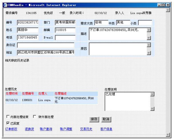 客戶向麥考林定購商品的最常用途徑就是電話訂貨,客戶撥打麥考林服務(wù)熱線進(jìn)入客服系統(tǒng)。系統(tǒng)會根據(jù)客戶的主叫號碼對客戶進(jìn)行識別,如果識別成功,座席代表屏幕上會自動彈出客戶資料和以往訂貨記錄;如果識別失敗,座席代表可以根據(jù)客戶通報(bào)的客戶代碼或姓名等信息查詢客戶資料。如果是新客戶,座席代表可以立即為他創(chuàng)建客戶檔案。
