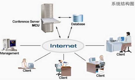 經(jīng)過(guò)種種測(cè)試,最后選定視維Super-V視頻會(huì)議系統(tǒng),山大聯(lián)潤(rùn)研發(fā)的視維視頻會(huì)議系統(tǒng)由服務(wù)器端軟件和客戶端軟件兩部分組成。其中安裝服務(wù)器端軟件的PC服務(wù)器必須有公網(wǎng)固定的IP地址;有較好的網(wǎng)絡(luò)帶寬條件,以保證正常的音視頻信號(hào)的傳輸。所有會(huì)議成員都需要在其個(gè)人計(jì)算機(jī)上安裝客戶端軟件,可以根據(jù)具體情況接入IP網(wǎng)絡(luò)。視維Super-V視頻會(huì)議系統(tǒng)將所參會(huì)人員通過(guò)IP網(wǎng)絡(luò)連接起來(lái),提供音頻、視頻以及數(shù)據(jù)協(xié)作等通訊服務(wù)。其網(wǎng)絡(luò)拓?fù)鋱D如下: