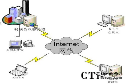 視維根據(jù)互聯(lián)網(wǎng)的網(wǎng)絡(luò)現(xiàn)狀和IT硬件資源制定了一套可行的平民化的低帶寬下的高清視頻會(huì)議解決方案。以企業(yè)總部為主會(huì)場(chǎng),其他地區(qū)的分公司、各營(yíng)銷網(wǎng)點(diǎn)和各移動(dòng)多媒體終端作為分會(huì)場(chǎng),其網(wǎng)絡(luò)拓?fù)鋱D如下: