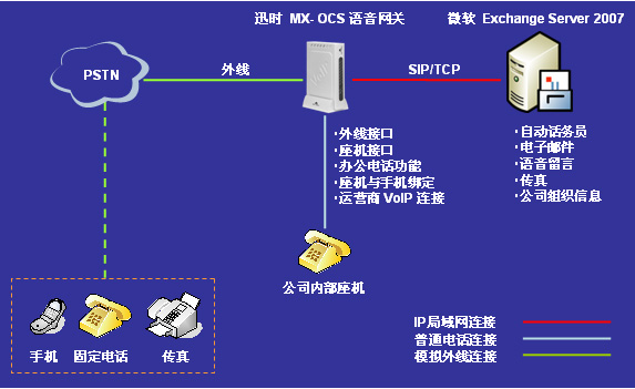 迅時通信針對微軟統(tǒng)一溝通解決方案,在2008年推出了MX-OCS系列辦公型VoIP語音網關。將微軟Exchange Server 2007 統(tǒng)一消息服務器與迅時通信MX-OCS網關集成而構成的解決方案(簡稱“1+1”方案),能大幅降低中小企業(yè)擁有統(tǒng)一溝通平臺的成本。