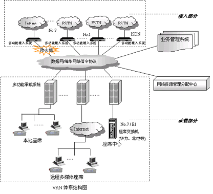 VAN(Voice Area Network)是一個(gè)支持多接入點(diǎn)、多承攬點(diǎn)、多業(yè)務(wù)點(diǎn)、多數(shù)據(jù)點(diǎn)的大型分布式呼叫中心構(gòu)造平臺(tái)。它針對(duì)大型分布式呼叫中心、企業(yè)營(yíng)銷(xiāo)網(wǎng)絡(luò)及行業(yè)公共交換平臺(tái)的業(yè)務(wù)需求和技術(shù)需求開(kāi)發(fā),支持多種接入方式并具備多種服務(wù)處理手段,同時(shí)可利用其軟件平臺(tái)——DCCMS呼叫管理系統(tǒng)對(duì)多種業(yè)務(wù)進(jìn)行分散式管理,對(duì)各類(lèi)資源進(jìn)行統(tǒng)一控制,實(shí)現(xiàn)全網(wǎng)數(shù)據(jù)協(xié)同管理。
