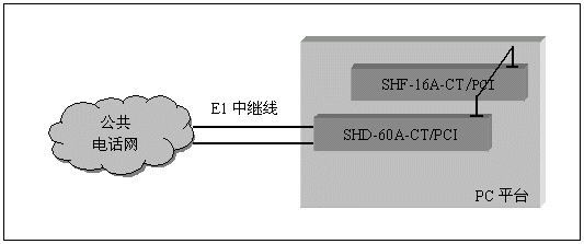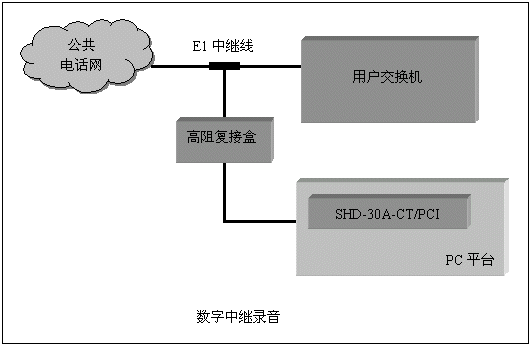 通道數(shù)較多的大中型應(yīng)用系統(tǒng),一般采用數(shù)字中繼線(E1)接入公共電話網(wǎng),三匯公司的SHD系列數(shù)字中繼卡可以提供相應(yīng)的解決方案。SHD系列數(shù)字中繼在一塊卡上集成了E1線接口,語(yǔ)音資源,信令處理等所必須的全部功能,其接入信令處理模塊可處理中國(guó)1號(hào)信令(SS1),7號(hào)信令(SS7),ISDN PRI協(xié)議(DSS1),單塊卡最多可支持4個(gè)E1接入。通過(guò)CT-BUS(或ST-BUS)總線,還可以在數(shù)字中繼線上實(shí)現(xiàn)傳真功能。典型應(yīng)用結(jié)構(gòu)如下圖: