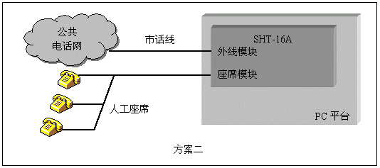 人工座席是呼叫中心(Call Center)一類(lèi)應(yīng)用的主要組成部分。三匯語(yǔ)音卡對(duì)人工座席提供了兩套解決方案:使用SHU系列座席卡,通過(guò)交換總線與其它卡互聯(lián),為整個(gè)系統(tǒng)提供座席資源。使用SHT系列模塊化語(yǔ)音卡,在部分通道使用座席模塊,可用單塊卡實(shí)現(xiàn)座席和外線系統(tǒng)。第二種方式特別適用于小型呼叫中心,總機(jī)話務(wù)員等應(yīng)用。三匯公司的座席通道可以直接連接各類(lèi)普通電話機(jī),利用座席卡配置相應(yīng)的軟件,還可以構(gòu)成板卡交換機(jī),完全取代企業(yè)用戶(hù)交換機(jī)。這類(lèi)應(yīng)用的典型結(jié)構(gòu)如下圖:
