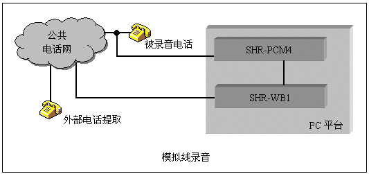 三匯公司的SHR系列監(jiān)控錄音卡可以實(shí)現(xiàn)對(duì)電話線路或其它信號(hào)源如話筒信號(hào)、對(duì)講機(jī)等進(jìn)行錄音。模擬線錄音采用高阻抗并線的方式,對(duì)被錄音對(duì)象無(wú)影響。可以檢測(cè)電話線上直流電壓、DTMF號(hào)碼、FSK/DTMF CallerId等信號(hào)。采用配套的高阻復(fù)接盒,SHD系列數(shù)字中繼卡還能完成對(duì)數(shù)字中繼線的監(jiān)控錄音,并能分析線路上的信令,從而取得通話狀態(tài)和主被叫號(hào)碼。這兩種錄音系統(tǒng)的結(jié)構(gòu)如下圖: