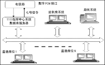 系統(tǒng)由以下部分組成:CTI服務(wù)器、接警席位系統(tǒng)、班長(zhǎng)席位系統(tǒng)、局長(zhǎng)席位系統(tǒng)。各部分系統(tǒng)可根據(jù)實(shí)際需求任意組合,各個(gè)部分充分考慮到開(kāi)發(fā)的實(shí)用性、可靠性、先進(jìn)性和開(kāi)放性,能夠?qū)④浖S護(hù)降到最小程度,這樣的設(shè)計(jì)可以讓用戶(hù)能夠改動(dòng)硬件和數(shù)據(jù)庫(kù),卻不用將軟件整體更換,保證了用戶(hù)的投資。其結(jié)構(gòu)如圖2所示。