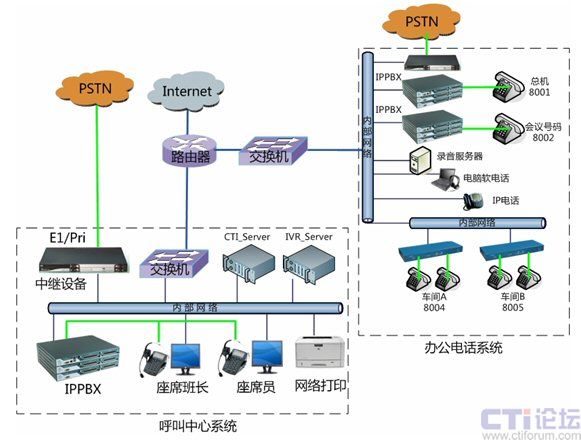 化。在總部核心機(jī)房將電話外線中繼接口與中繼網(wǎng)關(guān)設(shè)備連接,并通過內(nèi)部網(wǎng)絡(luò)對接到IPPBX,分別應(yīng)用于辦公電話系統(tǒng)和公司呼叫中心系統(tǒng)。設(shè)備用于公司辦公電話和公司會議系統(tǒng),可最大支持到30方會議,或多個小型獨(dú)立會議系統(tǒng)。各個不同的車間可以采用電話線之間接入分機(jī),或采用傲威AVG800的網(wǎng)關(guān)通過網(wǎng)絡(luò)接入,并注冊到IPPBX系統(tǒng)實(shí)現(xiàn)內(nèi)網(wǎng)網(wǎng)絡(luò)分機(jī)。對將來的分公司的辦公電話系統(tǒng),將不再使用傳統(tǒng)的PBX設(shè)備,而是直接利用IPPBX系統(tǒng),通過IP