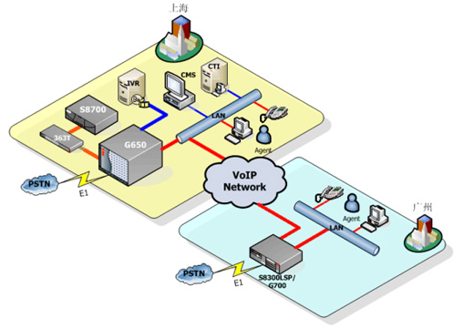 為了進一步拓展中國市場,并且針對某些特定的地方需要提供本地化方言服務,S公司需要在廣州設立一個新的座席集群,座席數量在50左右,需要擁有與中心點一樣完善的功能,實現(xiàn)呼叫的自由分配,共享中心點設施,比如CMS(呼叫中心報表系統(tǒng))、IVR(交互式語音應答系統(tǒng))和CDR(呼叫詳細記錄)等等。并提供最強的穩(wěn)定性和冗余備份功能。