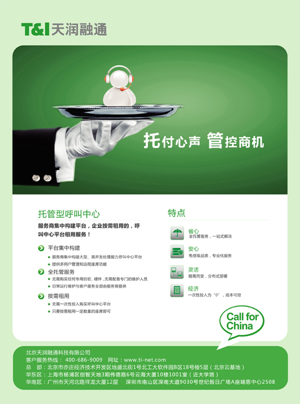 北京天潤融通科技有限公司致力于為企業(yè)提供簡單、易用、可依靠的托管型呼叫中心服務,幫助企業(yè)更好地經(jīng)營其客戶資源。天潤融通是國內呼叫中心領域內領先的“云應用”提供者。先后承接了百度全國客服中心、平安保險北京客服中心、慧聰網(wǎng)呼叫中心、央視網(wǎng)絡客服中心、安博教育客服中心、圓通快遞客戶服務中心、飯統(tǒng)網(wǎng)客戶訂餐中心等大型的呼叫中心項目。服務的客戶遍及互聯(lián)網(wǎng)、教育培訓、金融服務、旅游票務、電子商務、食品飲料、醫(yī)療保健、消費品制造和銷售、物流、餐飲娛樂、電視購物等十多個領域達數(shù)千家企業(yè)客戶。