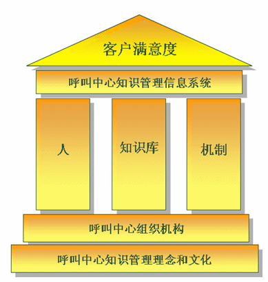 如上圖呼叫中心知識(shí)管理大廈。其是建立在呼叫中心知識(shí)管理理念文化、組織機(jī)構(gòu)基礎(chǔ)上,以人、知識(shí)庫(kù)、機(jī)制為核心,通過(guò)呼叫中心知識(shí)管理信息系統(tǒng)承載實(shí)施,以提高客戶滿意度為目的的綜合系統(tǒng)。