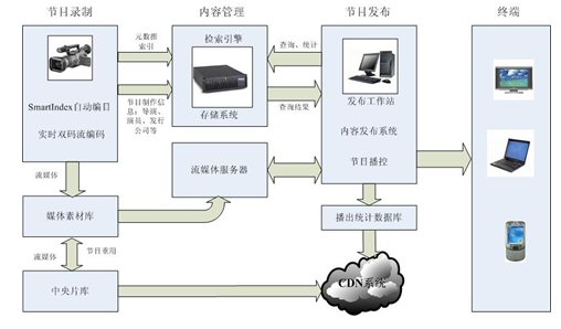 農(nóng)村黨員干部現(xiàn)代遠(yuǎn)程教育系統(tǒng)是涉及多個(gè)層面的系統(tǒng)工程,基礎(chǔ)設(shè)施建設(shè)內(nèi)容主要包括:節(jié)目制作平臺(tái)、中心資源庫(kù)、節(jié)目發(fā)布平臺(tái)、信息管理系統(tǒng)、接收終端等部分。該方案基于全球最成熟的寶麗星通軟件(北京)有限公司研發(fā)的寶麗通流媒體支撐平臺(tái),具備在現(xiàn)有網(wǎng)絡(luò)基礎(chǔ)架構(gòu)上開(kāi)展豐富多彩的面向農(nóng)村黨員和農(nóng)民用戶的視聽(tīng)類的綜合信息服務(wù)。系統(tǒng)結(jié)構(gòu)如下圖所示。
