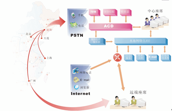 對于地區(qū)分布廣泛,而又要集中管理的企業(yè),可在各個(gè)局部地區(qū)設(shè)置遠(yuǎn)端座席,并通過網(wǎng)絡(luò)方便的接入中心系統(tǒng)。我們?yōu)檫h(yuǎn)端座席提供與中心座席完全相同的操作,遠(yuǎn)端座席可以根據(jù)各個(gè)地區(qū)的特定情況有針對性的處理各個(gè)局部地區(qū)的業(yè)務(wù),為中心分流壓力,同時(shí)中心系統(tǒng)也可以完全掌握遠(yuǎn)端座席的情況。我們可以非常明確的一點(diǎn)是:采用分布式座席的技術(shù),使得遠(yuǎn)端座席與中心座席除了地域上的差異,其它部分完全相同?梢哉f只要網(wǎng)絡(luò)無極限,座席分布就是無極限的。