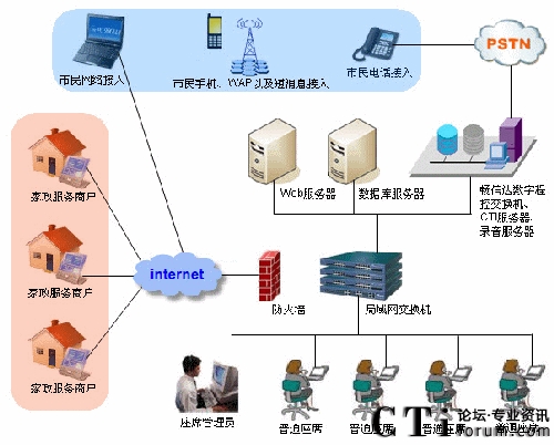 隨著國內城市化地不斷加快,人口老齡化的加劇,人民群眾對家政服務需求也越來越旺盛,家政服務業(yè)的重要性也日益凸顯。為了規(guī)范家政服務市場、整合家政市場資源、培育家政服務示范性企業(yè),國家商務部、財務部于2009年4月下發(fā)了《關于推進家政服務網(wǎng)絡體系建設的通知》的149號文件,啟動了家政服務網(wǎng)絡中心體系建設的項目,并提出了具體的規(guī)范和要求。以此為起點,為更好地服務社會滿足人民群眾日益增長的生活需求而努力。自文件下發(fā)以來,我公司就組織專門的項目組,對家政服務行業(yè)具體業(yè)務需求的調研以及開發(fā)工作。公司利用多年的開發(fā)經驗,經過幾個月的努力,終于在8月份完成了暢信達家政服務網(wǎng)絡中心的全套建設方案。與其它系統(tǒng)固化的功能設計不同,該方案可以靈活地定制業(yè)務模塊,方便各地的家政公司根據(jù)本市的情況和需求,確定適合自身的業(yè)務流程。系統(tǒng)業(yè)務模塊完整地覆蓋了家政服務的業(yè)務范圍與重點。并將家政服務的業(yè)務分為營業(yè)系統(tǒng)、賬務系統(tǒng)、后臺系統(tǒng)等部分,貫穿了市民從訴求提交、工單派發(fā)、工單處理、財務結算到回訪反饋的各個方面。系統(tǒng)還提供了完善的報表模塊準確反映業(yè)務和系統(tǒng)運營狀況,有力地支持對平臺進行運營管理工作。另外在方案設計上,除了滿足業(yè)務處理需要外,還充分考慮到系統(tǒng)的適應性、穩(wěn)定性和處理的能力。首先為了滿足各地市對家政平臺的不同需求,公司專門推出了基于IBM服務器的和暢信達標配服務器的兩種建設方案。暢信達標配服務器方案可提供最低4模擬外線最多1條數(shù)字中繼(E1)接入,適用于初期規(guī)模較小且投資規(guī)模不大的客戶。而基于IBM服務器的方案,則主要是滿足業(yè)務量較大,同時對設備配置要求高的城市,以數(shù)字線接入為主。多種建設模式充分體現(xiàn)了方案的靈活性、可擴展性的特征,有效地減少了運營風險,提升了個性化定制化服務的水平。其次,根據(jù)家政市場需求預測以及已開通家政服務網(wǎng)絡中心城市的實際運營情況,一個中型城市,預計電話開通之后,話務量平均每天近3000個,這就要求系統(tǒng)不但有穩(wěn)定的性能而且要有強大的處理能力。我公司從系統(tǒng)平臺構建、業(yè)務流程設計、設備性能、組網(wǎng)設計等方面著手,為系統(tǒng)提供了足以確保安全穩(wěn)定運行的支持。