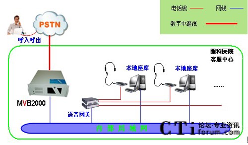 醫(yī)院采用暢信達通信MVB2000系統(tǒng)作為交換平臺,采用1路E1數(shù)字中繼線接入,對外公布統(tǒng)一的外線呼入號碼,采用語音網(wǎng)關(guān)結(jié)合話機作為座席終端,前期投入8位人工座席,系統(tǒng)架構(gòu)形式如下: