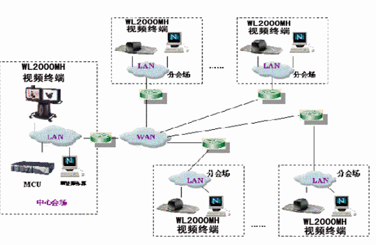 各個(gè)節(jié)點(diǎn)上的會(huì)議室型WL-2000MH終端的數(shù)據(jù)流可向多點(diǎn)控制器MCU發(fā)送動(dòng)態(tài)高清晰度圖像(720*576的FULL D1), 可以把主會(huì)場(chǎng)攝象機(jī)畫面清晰地傳輸?shù)剿蠾L-2000MH終端。