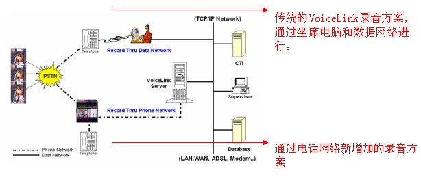 Voicelink 監(jiān)控錄音方案完全適應(yīng)現(xiàn)代呼叫中心的環(huán)境。Voicelink能有效的節(jié)約成本,它不需要專用硬件,能有效的利用包括座席計算機(jī)和網(wǎng)絡(luò)等公司的現(xiàn)有資源來進(jìn)行日常電話錄音。但考慮到有些呼叫環(huán)境只有涉及到電話呼入和呼出,也不用跟業(yè)務(wù)應(yīng)用或后臺數(shù)據(jù)(如證券交易平臺)交互,現(xiàn)在,Voicelink增加了錄音方式來提高解決方案的能力,該錄音方式是通過電話網(wǎng)絡(luò)來錄音的,該新增加的錄音方式完全獨(dú)立于計算機(jī)和數(shù)據(jù)網(wǎng)絡(luò)。下圖顯示Voicelink提供不同的方式,形成一個單一的錄音平臺。