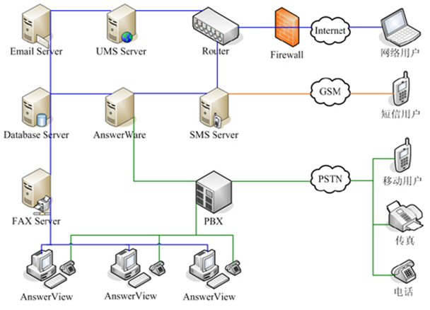 AnswerWare系統(tǒng)包括服務(wù)端控制程序、UMS(統(tǒng)一消息服務(wù))平臺、DialWare和客戶端程序AnswerView。