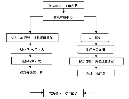 顧客的電話訂購主要有兩種方式:一種方式為在購物平臺(tái)400或800電話的IVR流程中根據(jù)提示語音來完成訂購過程;另一種方式為人工服務(wù),客服人員幫助顧客完成訂購過程。