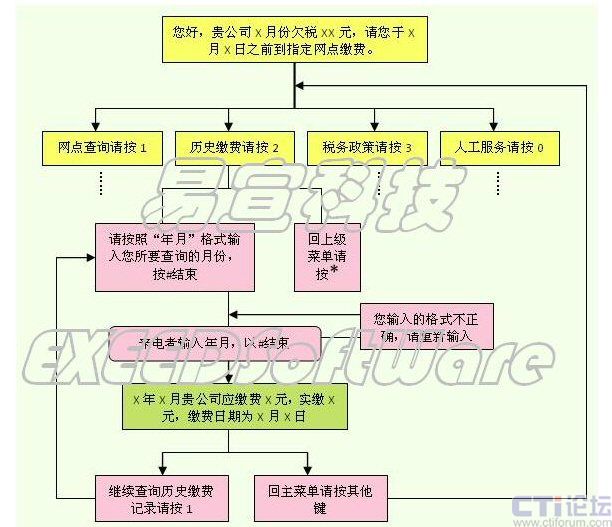 - 播放內(nèi)容為IVR交互式語音流程(也叫語音架構(gòu)),用戶和稅務(wù)部門能夠通過用戶的選擇產(chǎn)生互動交流;