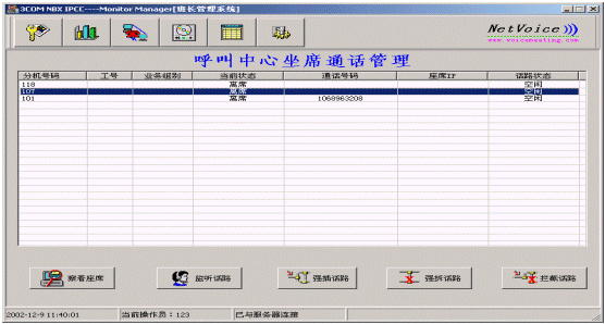 系統(tǒng)提供實(shí)時(shí)直觀的監(jiān)控界面,并提供各類(lèi)實(shí)用的坐席監(jiān)控方法如:監(jiān)聽(tīng)、強(qiáng)插、強(qiáng)拆等功能操作,從而實(shí)現(xiàn)了對(duì)各應(yīng)用坐席的強(qiáng)有力的監(jiān)控、管理功能。