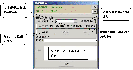 如果有電話打入時,在屏幕的右側(cè)會彈出一個對話框,它顯示了當前來電的號碼和通話人(如果在地址簿中沒有記錄則顯示為未知),點擊彈出全部菜單功能,它相當于一個功能強大的通話記事本,用它既可以邊接聽電話邊整理相關通話的文字記錄,又可以錄下通話的全部內(nèi)容。如果這個電話是您不愿接聽的,也可以將它設置為“免打擾”,這樣,這個號碼以后將存入免打擾名單中,若此號碼再呼入,系統(tǒng)將自動掛斷此呼叫。如果這個電話是您認為的重要客戶打過來的,您也可以將此號碼添加到重要客戶組中,以便您今后接聽或設置電話轉(zhuǎn)移時能與其它呼入電話相區(qū)分。