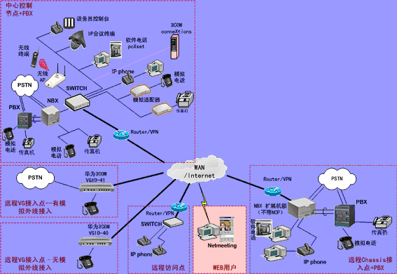 ②.統(tǒng)一的分支機構(gòu)電話平臺,可以支持任何數(shù)據(jù)骨干網(wǎng)(WAN)技術,包括DDN、幀中繼、VPN、xDSL等。3COM NBX 系統(tǒng)也可以在無線局域網(wǎng)上運行。
