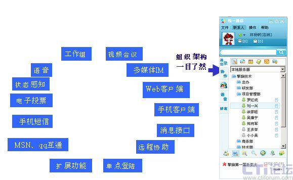 UcSTAR:Unified Communication Star,是擎旗技術研發(fā)的統(tǒng)一通訊平臺,它為企業(yè)提供多種通訊手段(包括即時通信、視頻、語音、郵件、短信、MSN/QQ互通等);并可融合企業(yè)的各種應用系統(tǒng)(OA、ERP、CRM、網站、電子商務系統(tǒng)等);將企業(yè)對外溝通、銷售和服務、對內溝通和協(xié)作無縫整合;輕松實現(xiàn)無地域/時間限制的,可管理、可控制、可擴展的,集團外部溝通、服務和銷售一體化的統(tǒng)一工作平臺。此外,它也可被分離應用為企業(yè)IM及實時協(xié)作系統(tǒng)、多媒體呼叫中心系統(tǒng)、專業(yè)級的IP視頻會議系統(tǒng)等。