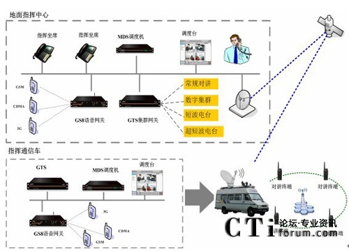 如出現(xiàn)突發(fā)事件,像地震、洪水等等情況,所有通信設(shè)備均損壞,指揮中心無(wú)法收到現(xiàn)場(chǎng)情況以及無(wú)線電監(jiān)測(cè)情況,所以在指揮車和指揮中心部署了衛(wèi)星系統(tǒng),此時(shí)可通過(guò)衛(wèi)星鏈路將信息反饋給指揮中心,確?蓪(shí)時(shí)與無(wú)線電指揮中心保持通信。