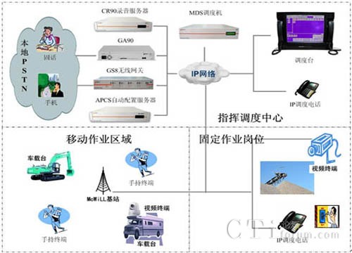 MDS系統(tǒng)可以應(yīng)用于各種作業(yè)現(xiàn)場(chǎng)的指揮調(diào)度, MDS系統(tǒng)不但支持系統(tǒng)基本的語(yǔ)音通信,調(diào)度中心可以通過(guò)視頻、數(shù)據(jù)、文本消息等綜合的多媒體方式與作業(yè)人員進(jìn)行通信交互,滿足各種復(fù)雜環(huán)境下的指揮調(diào)度需求。系統(tǒng)可以通過(guò)GS8無(wú)線網(wǎng)關(guān)、GA90 E1/T1網(wǎng)關(guān)等設(shè)備實(shí)現(xiàn)與PSTN網(wǎng)絡(luò)的互聯(lián),滿足與手機(jī)和固話網(wǎng)絡(luò)用戶接入需要。豐富的終端類型可以滿足用戶對(duì)固定崗位、移動(dòng)人員及車輛設(shè)備等不同環(huán)境的使用需求,根據(jù)人員崗位工作性質(zhì)可以配置IP調(diào)度話機(jī)、手持終端和車載臺(tái)等終端。