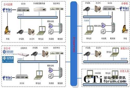 - 分布式部署:總部和各分支機(jī)構(gòu)的分機(jī),是通過IP網(wǎng)絡(luò)融合在一個(gè)語(yǔ)音平臺(tái)上來實(shí)現(xiàn)內(nèi)部通信?偛亢娃k事處分機(jī)、家庭辦公分機(jī)、出差人員的軟電話均注冊(cè)在總部的SE150上,各分公司的分機(jī)注冊(cè)在本地的SE150上,由本地的SE150管理。