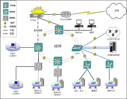 在城域網(wǎng)的核心節(jié)點(diǎn)下可放置多臺接入服務(wù)器,單臺R4000接入服務(wù)器可同時(shí)為多個(gè)小區(qū)的用戶提供接入服務(wù),提供多種認(rèn)證方式(包括WEB認(rèn)證、PPPoe認(rèn)證、802.1x認(rèn)證)從而形成以點(diǎn)帶面的應(yīng)用格局?紤]到最大程度上保證用戶的使用習(xí)慣和減小網(wǎng)絡(luò)維護(hù)工作量等因素,全部使用基于IE瀏覽器的Web認(rèn)證方式,配合城域網(wǎng)的Radius服務(wù)器能為用戶提供分布式的認(rèn)證控制和集中的計(jì)費(fèi)功能。
