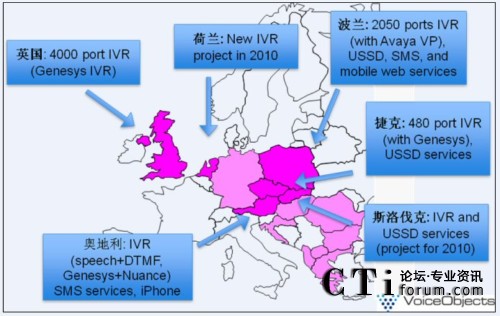 VoiceObjects在T-Mobile的應(yīng)用橫跨歐洲幾個(gè)國(guó)家,VoiceObjects在T-Mobile主要的挑戰(zhàn)來(lái)自三方面。第一,T-Mobile在歐洲幾個(gè)國(guó)家的自服務(wù)渠道多元化,短信、USSD、Mobile
