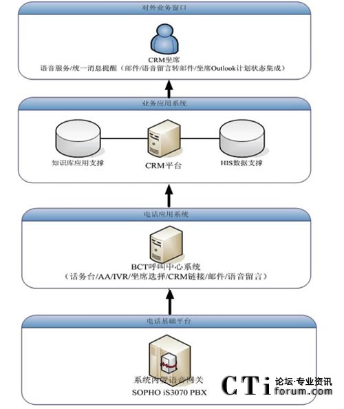原先電話系統(tǒng)與CRM系統(tǒng)是獨立的兩個系統(tǒng),客服人員面對大量的客戶,迅速的獲悉來電客戶的身份、背景資料以及歷史資料在很大程度上決定了其服務質量。BCT呼叫中心系統(tǒng)位于PBX與CRM之間,作為一個中間的橋梁,對PBX送來的電話信息或者用戶輸入的卡號等數(shù)據(jù)進行處理分析,對主叫號碼或用戶輸入卡號進行識別后,傳遞給CRM;CRM檢索與其相連的HIS(醫(yī)院信息系統(tǒng))的數(shù)據(jù)庫,將客戶資料以及相關的歷史記錄通過彈出網(wǎng)頁的模式,同步的顯示在坐席的計算機上,方便客服代表的輸入和后續(xù)操作,提高了效率與正確率。同時,客戶代表還可以在CRM頁面中點擊電話號碼,通過BCT發(fā)起電話呼叫來聯(lián)系客戶,來處理用戶回訪等工作。