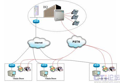 通過這種架構(gòu),各連鎖分店的話機(jī)與總部內(nèi)部話機(jī)之間的聯(lián)系便可以透過IP網(wǎng)絡(luò)進(jìn)行,無須再支付任何長途通話費(fèi)用。
