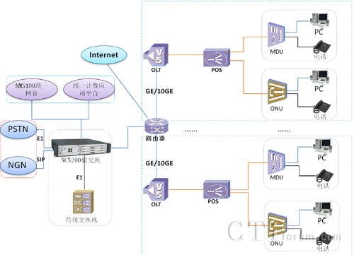 震有科技根據(jù)行業(yè)客戶的需求,推出了“NC5200系列產(chǎn)品+xPON產(chǎn)品”的行業(yè)接入網(wǎng)綜合應(yīng)用解決方案,即“NGN+xPON”行業(yè)應(yīng)用解決方案。該方案主要采用了NGN架構(gòu)的軟交換技術(shù)與xPON技術(shù)相結(jié)合,實(shí)現(xiàn)了從傳統(tǒng)的接入網(wǎng)向光纖接入網(wǎng)平滑過渡升級(jí)。該解決方案中NC5200系列產(chǎn)品主要完成語音交換及與語音相關(guān)的增值業(yè)務(wù)功能;xPON產(chǎn)品在該方案中作為語音、數(shù)據(jù)、視頻業(yè)務(wù)的承載平臺(tái),主要滿足了語音、數(shù)據(jù)及CATV或IPTV綜合業(yè)務(wù)接入要求。