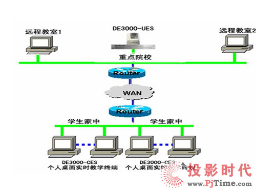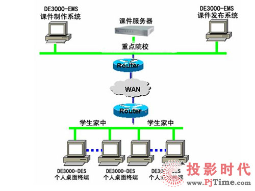將全省各地市級(jí)院校與區(qū)縣級(jí)院;蛩搅⒃盒_B接起來(lái),組成一個(gè)相對(duì)簡(jiǎn)單卻有效的遠(yuǎn)程教育網(wǎng)絡(luò),使教學(xué)水平相對(duì)落后地區(qū)的學(xué)生能方便地享用遠(yuǎn)程教育網(wǎng)所提供的優(yōu)秀教育資源,通過(guò)實(shí)時(shí)授課、課件學(xué)習(xí)等方式極大的方便學(xué)生學(xué)習(xí),提高成績(jī)?紤]到區(qū)縣級(jí)院校的教學(xué)水平和經(jīng)費(fèi)問(wèn)題,可以在各地市級(jí)院校配置CNKaran的DE3000-UES遠(yuǎn)程教育產(chǎn)品。而在區(qū)縣級(jí)院校只配置一臺(tái)PC加攝象頭,來(lái)實(shí)現(xiàn)遠(yuǎn)程授課或遠(yuǎn)程教學(xué)培訓(xùn)。