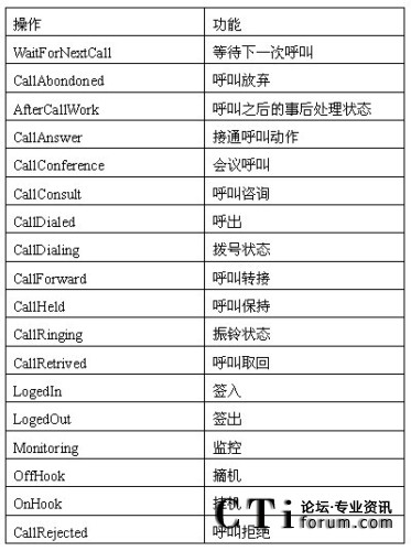在呼叫中心服務器發(fā)送事件時,它都會對事件的對象指定的一個狀態(tài)。在任何時間,ODS源數(shù)據(jù)庫中,每個對象都被指定成一個唯一的狀態(tài)。這些狀態(tài)都來自話務對象的操作。