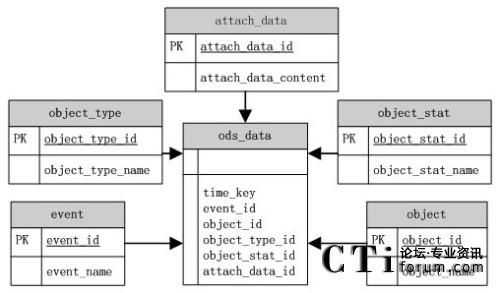 根據(jù)ODS源數(shù)據(jù)庫模型圖,ods_data表中存儲了事件發(fā)送的時間(time_key)、事件(event)、報表統(tǒng)計對象(object)、對象狀態(tài)(object_stat)、對象類型(object_type)以及一些隨路數(shù)據(jù)(attach_data)等信息。這些對象的詳細信息都是以各部分的ID來對內容進行關聯(lián)。