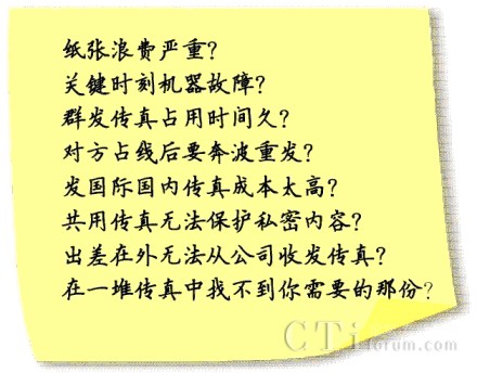 對(duì)于大多數(shù)企業(yè)而言,傳真有其不可替代的地位:銷售、采購(gòu)、訂單、合同,這些企業(yè)的生命線都離不開(kāi)傳真。使用傳統(tǒng)的傳真機(jī),您遇到過(guò)下列情況嗎?