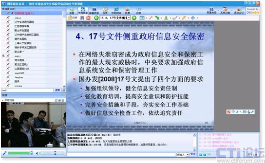 CTI論壇(ctiforum)05月07日消息: 4月8日-9日國家稅務(wù)總局組織全國省國稅地稅局IT主任與解放軍總參三院、中國信息安全評測中心、神州網(wǎng)御70多人在濟(jì)南錦繡山莊以及全國各地國稅地稅相關(guān)人員200多人使用自己辦公室的電腦通過盛維(Cenwave)新世紀(jì)提供的網(wǎng)絡(luò)視頻直播系統(tǒng)召開“國家稅務(wù)系統(tǒng)信息安全風(fēng)險評估啟動會”。此次會議是國家稅務(wù)總局首次租用網(wǎng)絡(luò)視頻會議直播系統(tǒng)召開全國性會議也是參會人數(shù)最多的一次,不僅打破地點(diǎn)人數(shù)的限制、克服了硬件設(shè)備的局限、節(jié)省行政成本,也是建設(shè)“兩型社會”的具體體現(xiàn)。