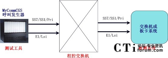 交換方案將MyCommCGS呼叫發(fā)生器和被測(cè)系統(tǒng)都通過同樣的電纜和信令方式連接到公網(wǎng)的程控交換機(jī)上,由呼叫發(fā)生器模擬公網(wǎng)用戶通過程控交換機(jī)向被測(cè)系統(tǒng)發(fā)起呼叫。