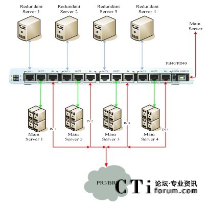 正常通信時(shí),BRI\PRI線路信號流向主服務(wù)器,進(jìn)行正常語音通信(BRI\PRI-OUT2),當(dāng)主服務(wù)器發(fā)生意外斷電,不能正常使用時(shí),BRI\PRI線路信號流向備份服務(wù)器(BRI\PRI-OUT1),保證正常通信。具體連接示意如下圖所示: