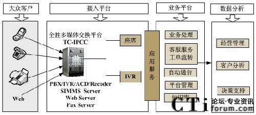 杭州全勝通訊有限公司自主研發(fā)的全勝多媒體IP呼叫中心平臺(TC-IPCC),是基于交換機級別的純IPCC平臺。該平臺集CTI、IVR、FAX、SMS、Email、錄音監(jiān)控、電話會議、統(tǒng)一智能路由、呼出管理等功能于一體,可用于構(gòu)建各類聯(lián)絡(luò)中心、自動語音系統(tǒng)、熱線電話、會議電話、電話銷售等系統(tǒng),輕松滿足各行業(yè)客戶、合作伙伴個性化建設(shè)需求。