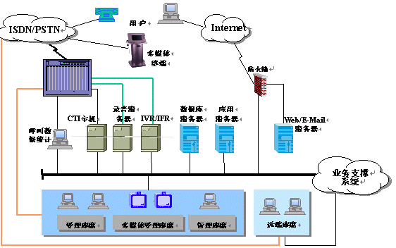 系統(tǒng)主要組成部分有呼叫匯接平臺、語音/傳真服務(wù)平臺、座席應(yīng)用平臺、Internet服務(wù)平臺、數(shù)據(jù)支撐平臺、網(wǎng)絡(luò)支撐平臺。