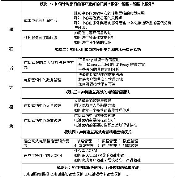 本課程以系統(tǒng)化的眼光,結(jié)合多個(gè)國(guó)際國(guó)內(nèi)領(lǐng)先企業(yè)的營(yíng)銷與管理實(shí)踐案例,與您分享國(guó)內(nèi)領(lǐng)先的呼叫中心和電話營(yíng)銷中心的戰(zhàn)略與運(yùn)營(yíng)經(jīng)驗(yàn),對(duì)現(xiàn)有資源進(jìn)行合理評(píng)估,解決實(shí)際問(wèn)題與困惑,突破面臨的瓶頸,整個(gè)課程具有高度的實(shí)戰(zhàn)性與可操作性。