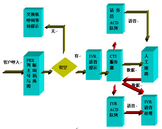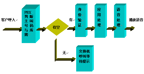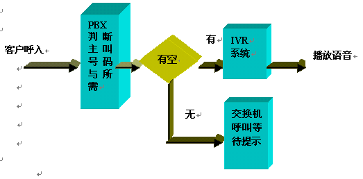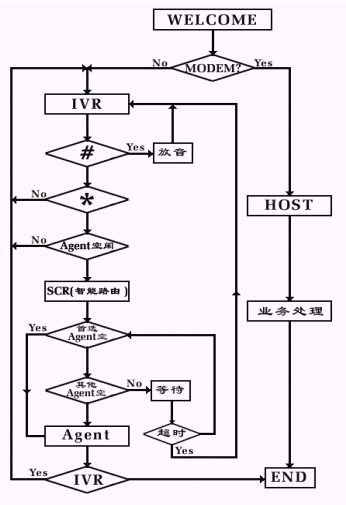 呼入一般都先通過ACD進行排隊,然后根據(jù)用戶選擇進入子系統(tǒng),流程圖如下: