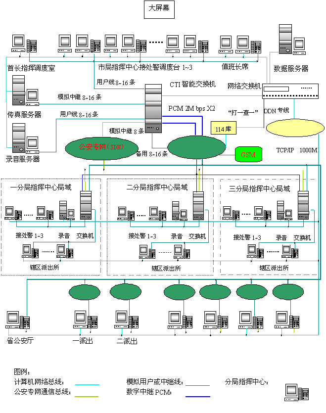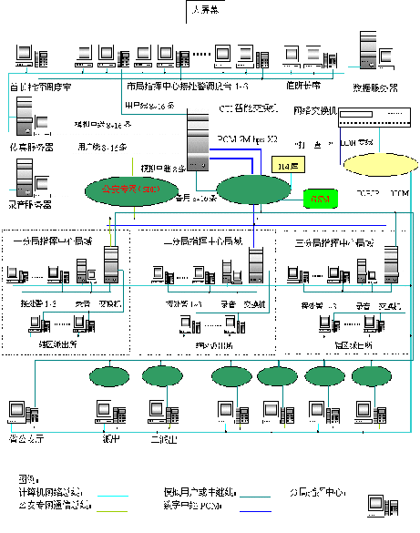 - 樹立大網(wǎng)絡(luò)概念:采用先進(jìn)的通訊、計(jì)算機(jī)網(wǎng)絡(luò)技術(shù)(采用CTI可編程交換技術(shù)),利用現(xiàn)有的通信資源,實(shí)現(xiàn)市局指揮中心與消防大隊(duì)、交警大隊(duì)、各派出所的計(jì)算機(jī)網(wǎng)絡(luò)及相關(guān)領(lǐng)導(dǎo)辦公室計(jì)算機(jī)大聯(lián)網(wǎng);形成全市范圍內(nèi)110、119、122有線、無線全方位立體調(diào)度語音通道大網(wǎng)。