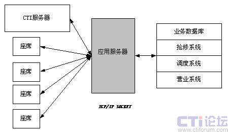 Ο數(shù)據(jù)接口采用三層C/S結(jié)構(gòu),通過構(gòu)建功能強(qiáng)大的應(yīng)用服務(wù)器,把呼叫中心的數(shù)據(jù)流與燃?xì)夤究蛻粝到y(tǒng)、營(yíng)業(yè)系統(tǒng)、搶修系統(tǒng)和燃?xì)庹{(diào)度系統(tǒng)結(jié)合起來,充分利用了已有系統(tǒng)標(biāo)準(zhǔn)的數(shù)據(jù)接口,實(shí)現(xiàn)對(duì)后臺(tái)數(shù)據(jù)庫(kù)的訪問。如圖: