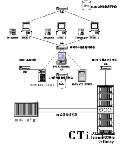 HXD09交換機通過E1上的信令完成控制話路,同時由FAX/IVR SERVER完成業(yè)務控制如放音、收號、收發(fā)傳真等。