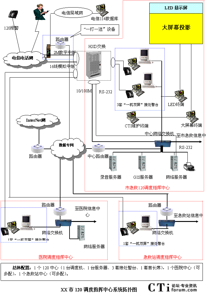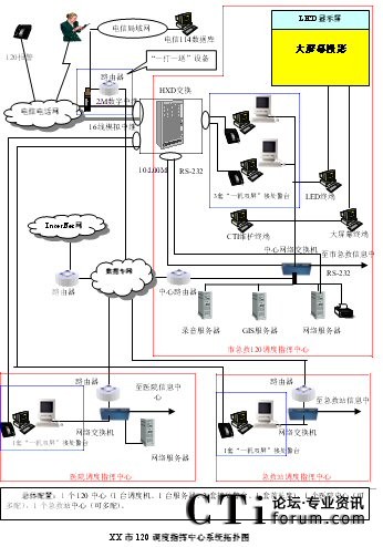 - 樹立大網(wǎng)絡概念:采用先進的通訊、計算機網(wǎng)絡技術(如CTI技術),利用現(xiàn)有的通信資源,實現(xiàn)市人民醫(yī)院120指揮中心與急救分站的計算機網(wǎng)絡及相關領導辦公室計算機大聯(lián)網(wǎng);形成全市范圍內(nèi)120有線、無線全方位立體調(diào)度語音通道大網(wǎng);為今后督查聯(lián)網(wǎng)、大聯(lián)動打下基礎。